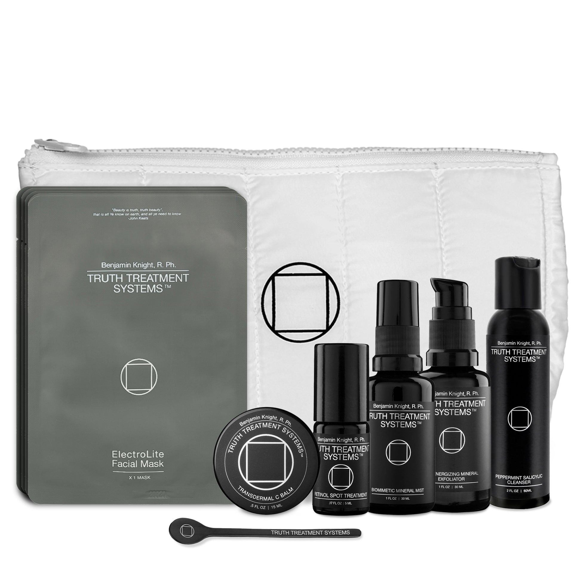 Truth Treatment Systems Acne Kit supports clearer, healthier skin by reducing inflammation, decongesting pores, and strengthening the skin barrier. Peppermint Salicylic Cleanser™ exfoliates and purifies, while Retinol Spot Treatment™ helps balance oil production and prevent new breakouts. Transdermal C BalmTM, Biomimetic Mineral Mist™, AHA Energizing Exfoliator™, and Electrolyte Facial Mask™ nourish, hydrate, and restore calm. With regular use, skin appears more balanced with fewer breakouts and improved clarity.
